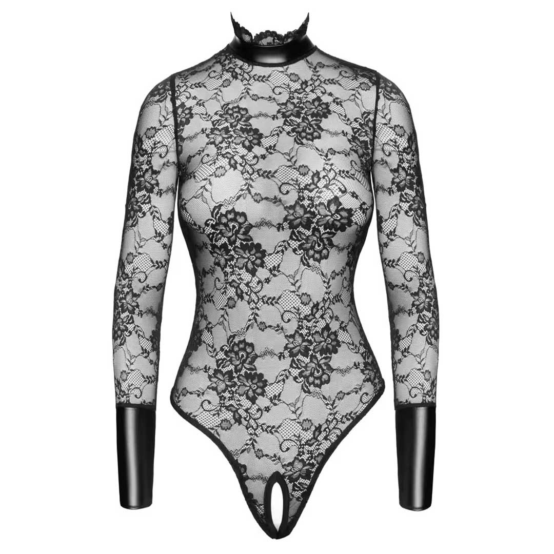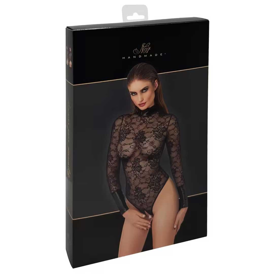 Body Seducator Noir. Dantela fina si tanga decupat. Maneci lungi si detalii lucios pentru un stil dominant si seductie maxima.