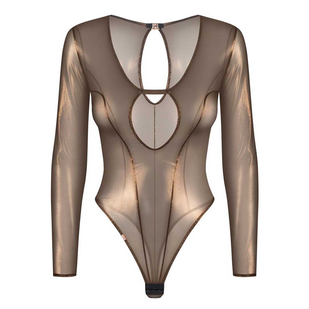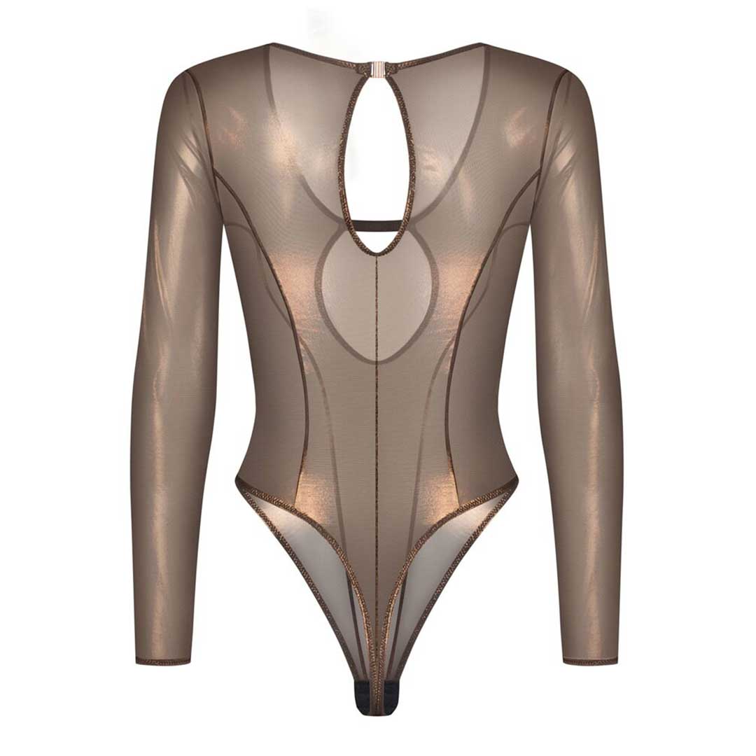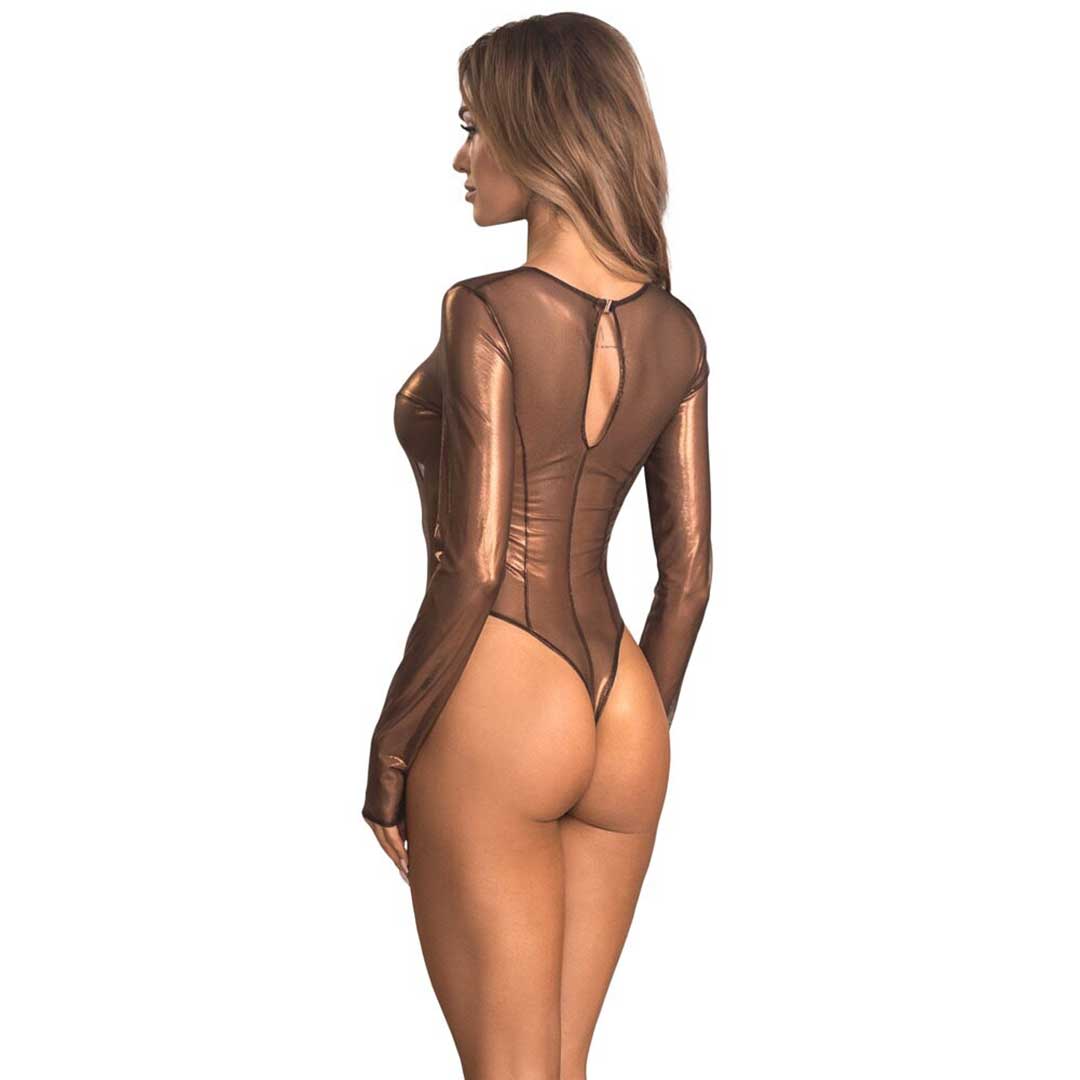 - Functii Cheie: Bronz Strălucitor, Maneci Lungi, Body Tanga, Inchiere Inghinala, Usor Transparent.