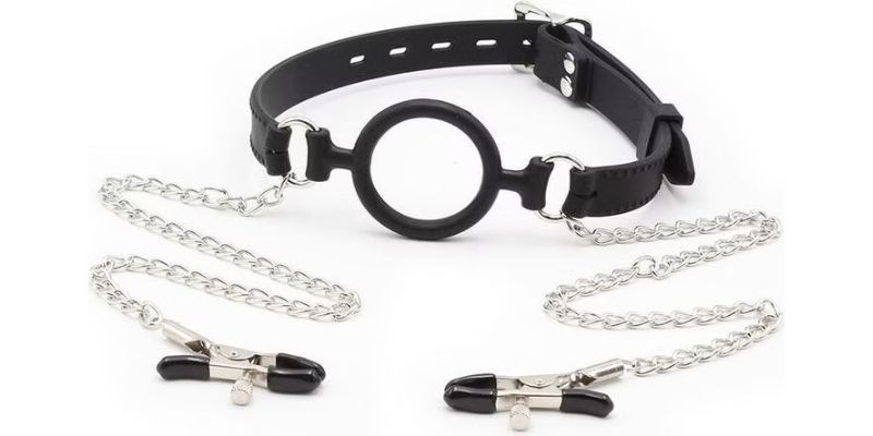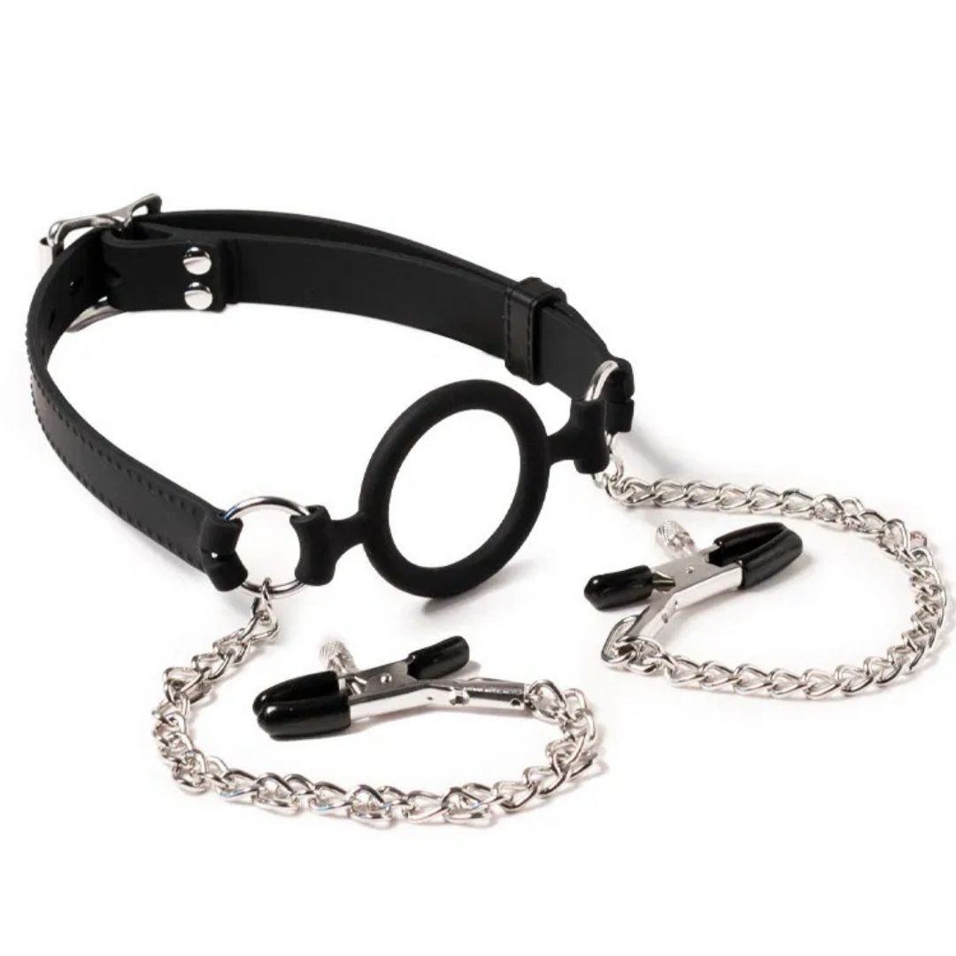 Designul inteligent al acestui model elimina barierele dintre accesoriile separate, unind un inel bucal ergonomic de doua cleme pentru sfarcuri prin lanturi metalice rezistente. Aceasta conexiune fizica inseamna ca orice incercare de miscare a capului sau orice gest de impotrivire se traduce instantaneu printr-o tractiune excitanta asupra sfarcurilor, fortand purtatorul sa ramana intr-o stare de prezenta absoluta.