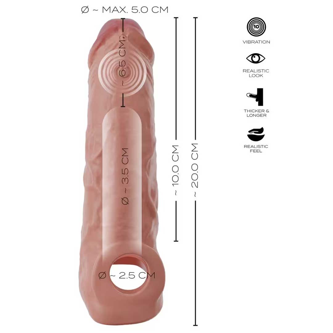 Cele 10 moduri diferite de vibratie ofera o varietate mare si pot fi controlate cu usurinta cu telecomanda sau direct de pe jucarie prin apasarea unui buton. Datorita varfului vibrator ferm, dar moale, captusit, penisul este extins cu 6,5 cm – si are o circumferintă vizibil mai mare datorita grosimii materialului. Pentru sex realist si implinit, cu vibratii care vor incanta ambii parteneri