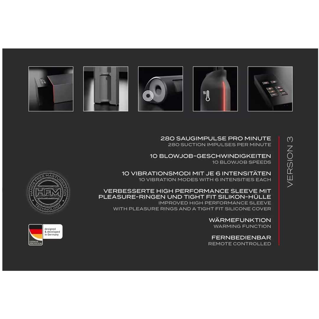 Suck-O-Mat 3 satisface partea superioara a penisului cu impulsuri puternice de pompare/aspirare si vibratii profunde. Mansonul moale, complet automatizat, din silicon, se miscă ritmic în sus si în jos pe penis pentru o placere hands-free.