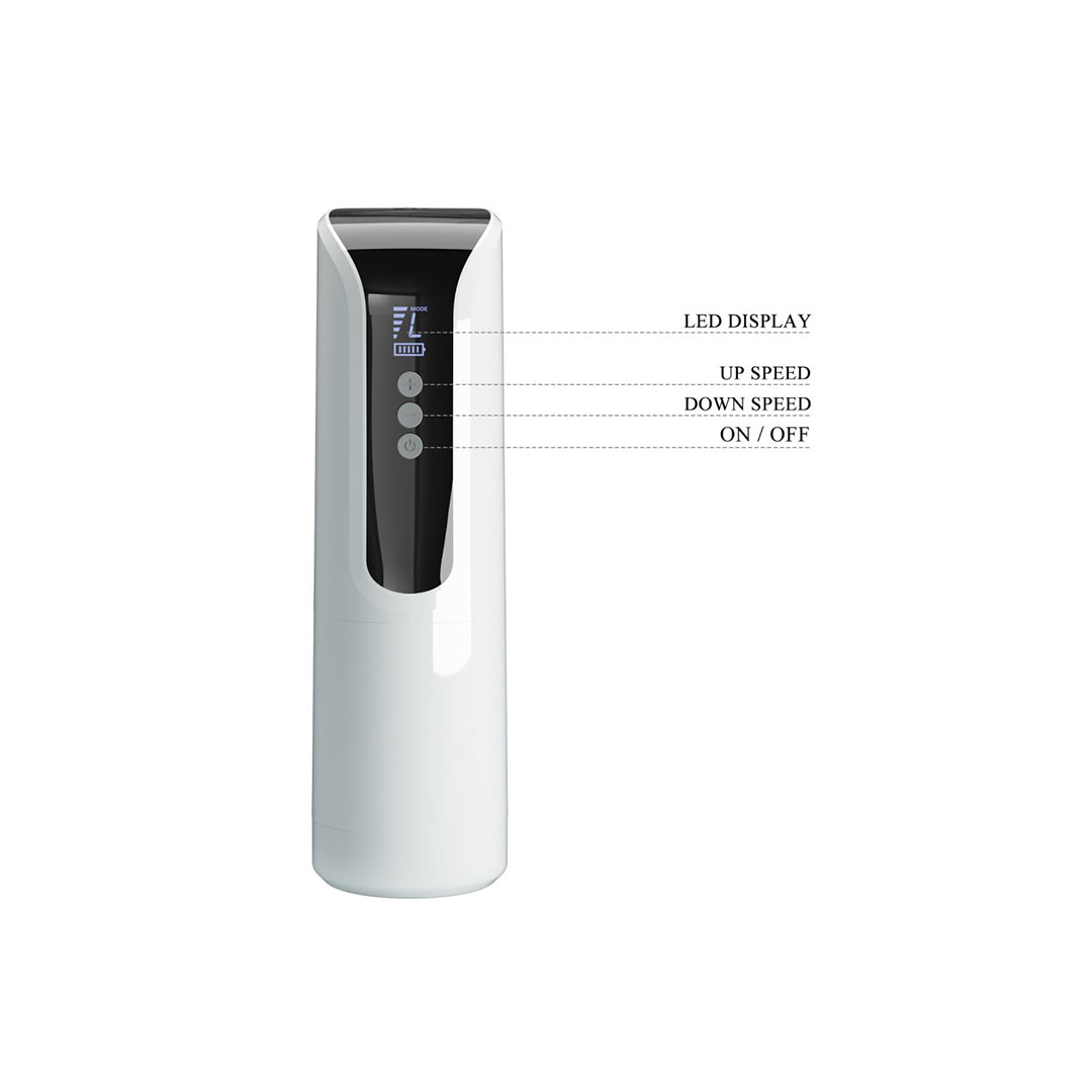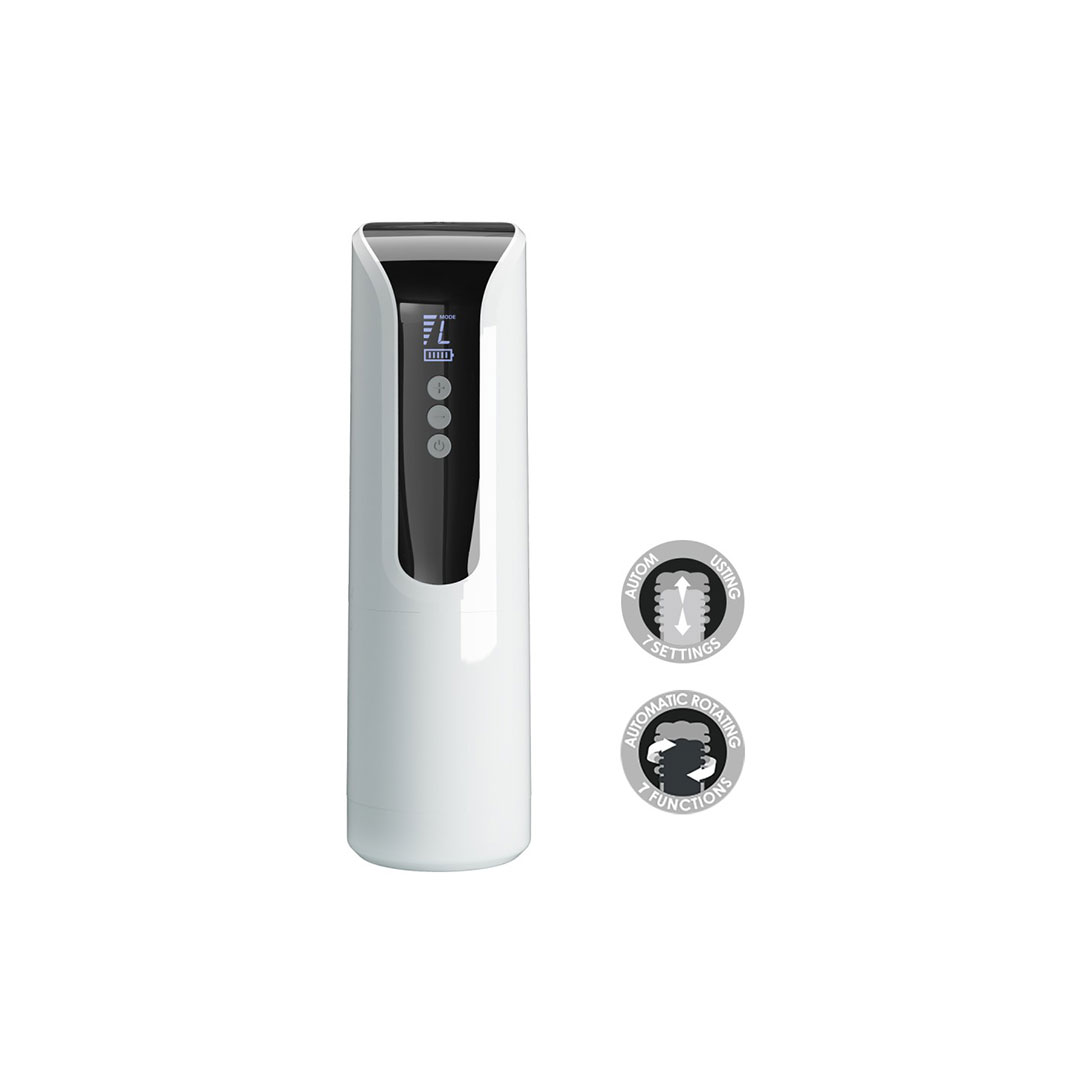 Acest masturbator all-in-one, disponibil în culorile Alb și Transparent, este fabricat din material TPR cu o structură internă detaliată ce oferă senzații cât mai autentice. Funcțiile combinate de împingere și rotație generează o stimulare dinamică, având la dispoziție 7 setări de împingere și 7 funcții de rotație. Pentru a avea controlul complet, dispozitivul asigură un ecran LED util, care afișează modul de vibrație, viteza și nivelul rămas al bateriei.