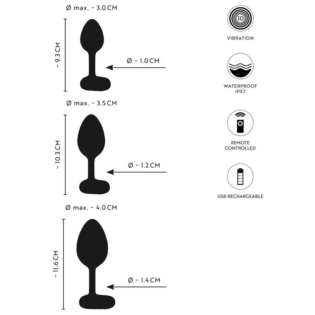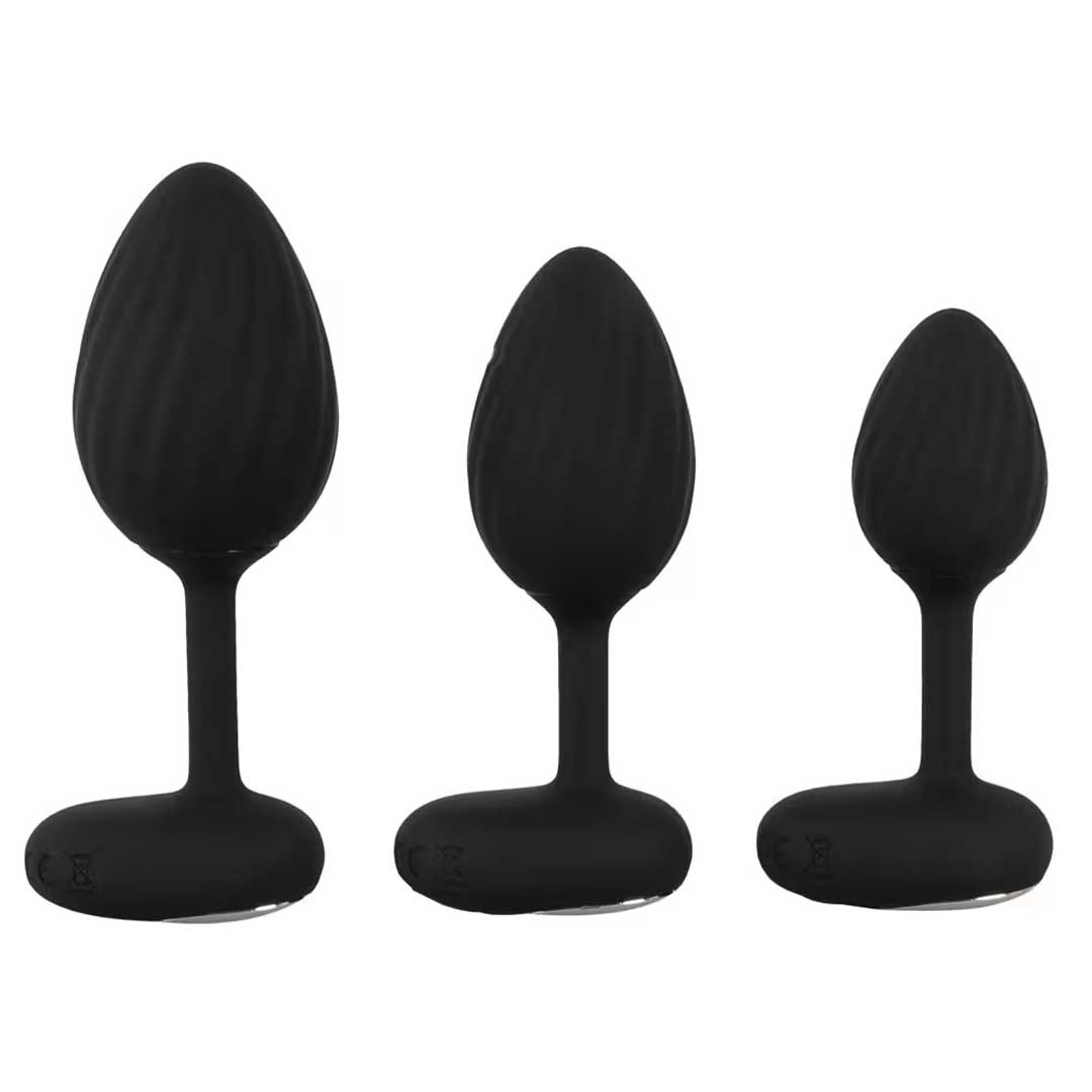 Set-ul contine 3 dopuri vibratoare de dimensiuni diferite, care ofera placere si confort maxim. Vibratiile puternice si intense sporesc placerea anala si pot fi usor controlate prin intermediul telecomenzii. Telecomanda are o raza de actiune de 5 metri, ceea ce inseamnă că poate fi controlata si de un partener.