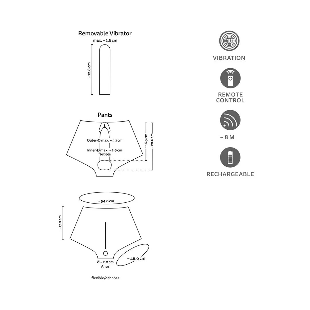 Pantalonii sunt fabricati din silicon catifelat, care nu doar imita aspectul pielii reale, dar ofera si o senzatie de moale la atingere, fiind mulati, dar elastici in acelasi timp pentru o potrivire perfecta si un confort sporit la purtare (potrivit pentru marimea M). Vibratorul poate fi indepartat din mansonul penisului, permitand purtarea pantalonilor si ca extensie de penis, iar capul proeminent al penisului adauga un plus de stimulare.