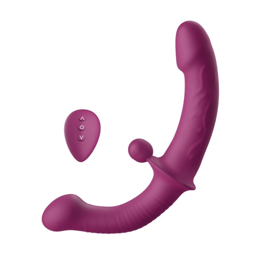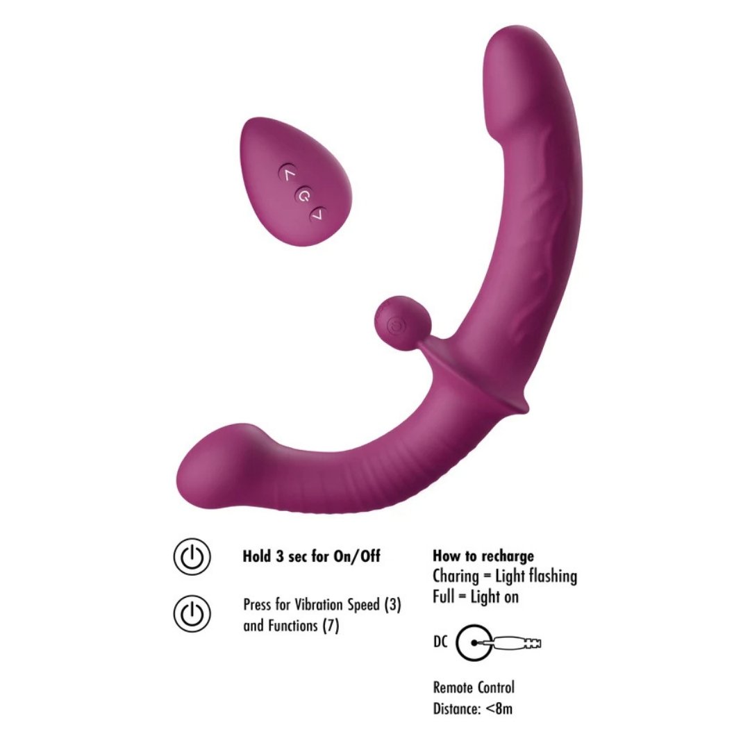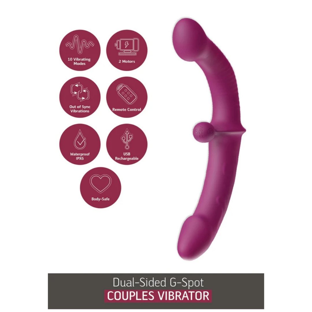 Acest vibrator cu doua capete este conceput special pentru a stimula simultan punctul G si clitorisul, oferind in acelasi timp posibilitatea unei conexiuni mai profunde in timpul jocurilor in cuplu. Dotat cu doua motoare extrem de puternice, vibratorul furnizeaza senzatii intense pe ambele parti, dispunand de 10 moduri de vibratie si 3 viteze care iti permit sa explorezi diverse intensitati, de la pulsatii delicate pana la ritmuri electrizante. Designul vibratorului curbat urmareste fidel anatomia feminina pentru o insertie facila si o pozitionare confortabila, in timp ce centrul vibrator adauga un plus de placere prin stimularea externa constanta. Fabricat din silicon medical matasos si sigur pentru corp, acest accesoriu sofisticat este echipat cu o telecomanda wireless pentru ajustari fara efort si este rezistent la stropire, fiind pregatit sa iti transforme fiecare fantezie intr-o experienta plina de putere si pasiune.