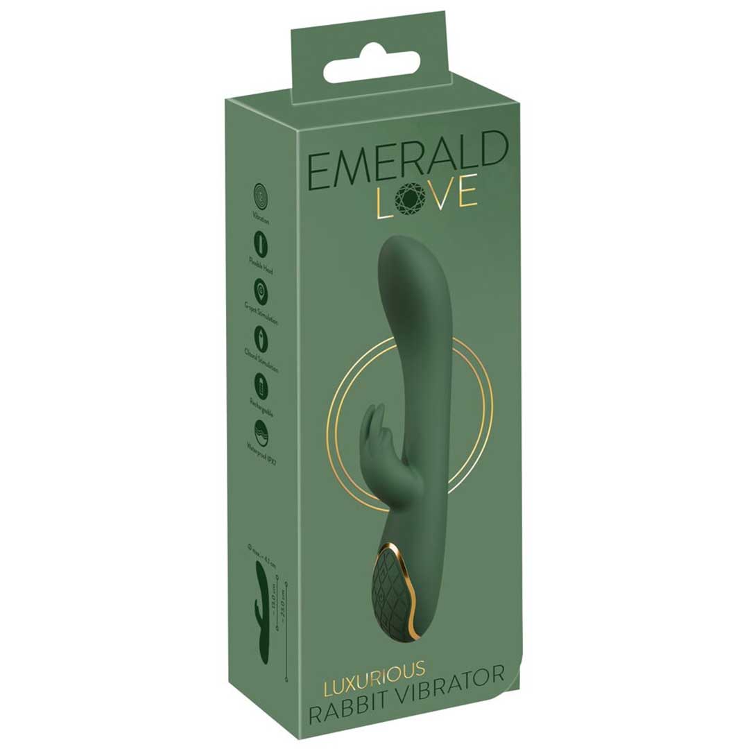 Vibratorul Rabbit Luxurious Emerald Love este un dispozitiv reincarcabil, construit pentru stimulare duala.